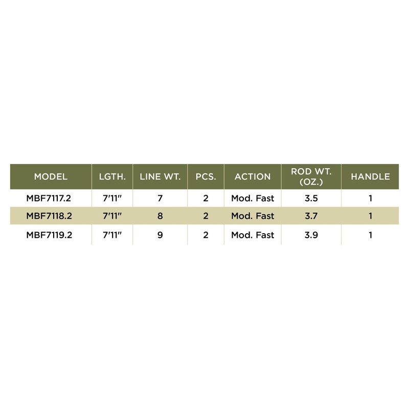 - SPECIFICATIONS: Length – 7’11”; Action – Mod. Fast; Pieces – 2; Line Wt. – 7 lbs; Rod Wt. – 3.8 oz; Handle - 1