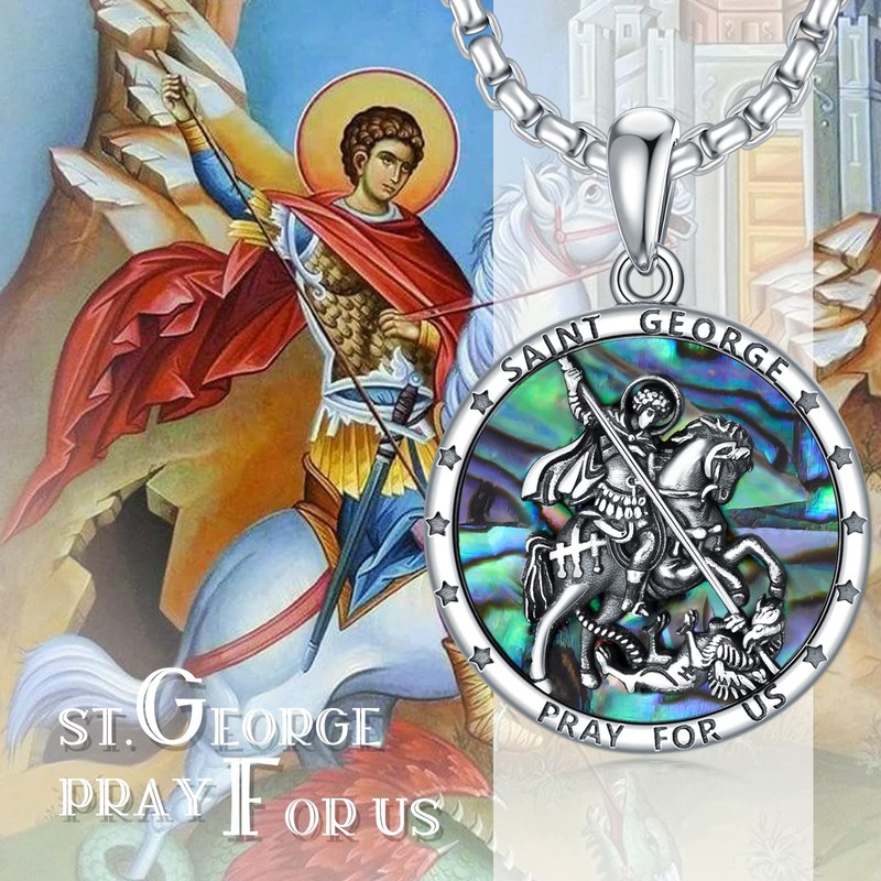 - 【St. Georg Amulett Medaille】: St. Georg ist der große Schutzpatron, mit dem Geist des Schutzes der Schwachen, die Bekämpfung der Eindringlinge, und die Erreichung der Heiligkeit durch Opfer. Das Tragen der Medaille bringt Glück, schützt uns vor allem Unheil und heilt alle Krankheiten. St. George Halskette mit bunten Abalone Muscheln und graviert mit den Worten "SAINT GEORGE PRAY FOR US".