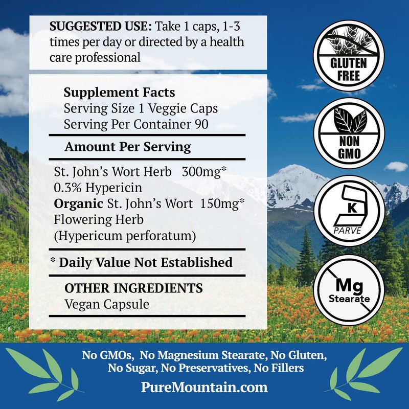 Pure Mountain Botanicals St. John's Wort Capsules with 450mg Formula of Organic Herb and St John's Wort Extract