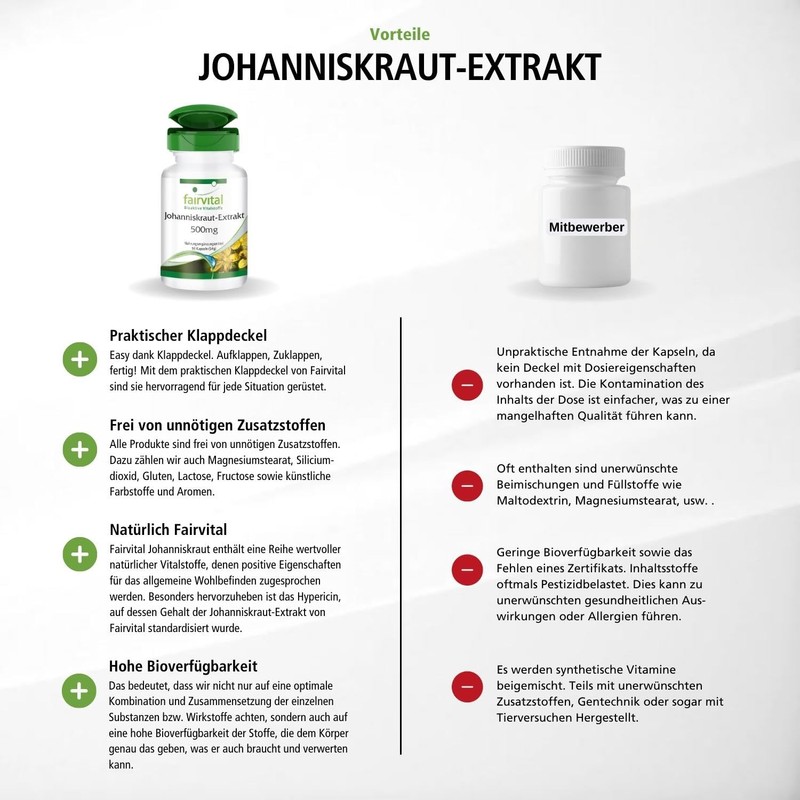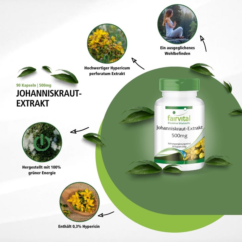 - ✔ fairvital German quality: daily dose: 3 capsules per day contain 1500 mg St. John's wort extract, of which 4.5 mg hypericin. High dose. Excellent value for money! Pure substance without additives