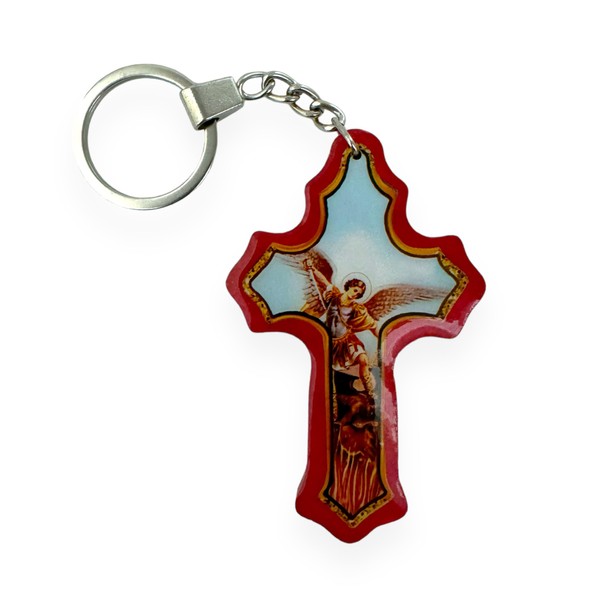 St Michael Red Wooden Cross Keychain Gift Keepsake Collectible Accessory Catholic San Miguel Arcangel Llavero