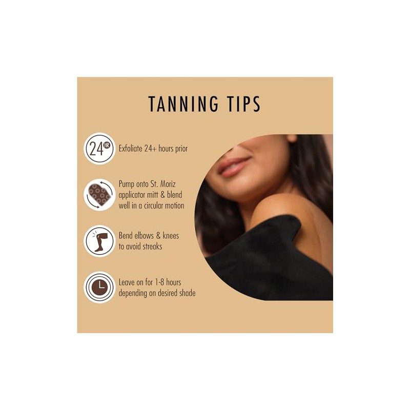 - For best results: exfoliate and shave 24 hours prior, apply with a St Moriz tanning mitt, bend elbows and knees during application and avoid contact with water during the developing time