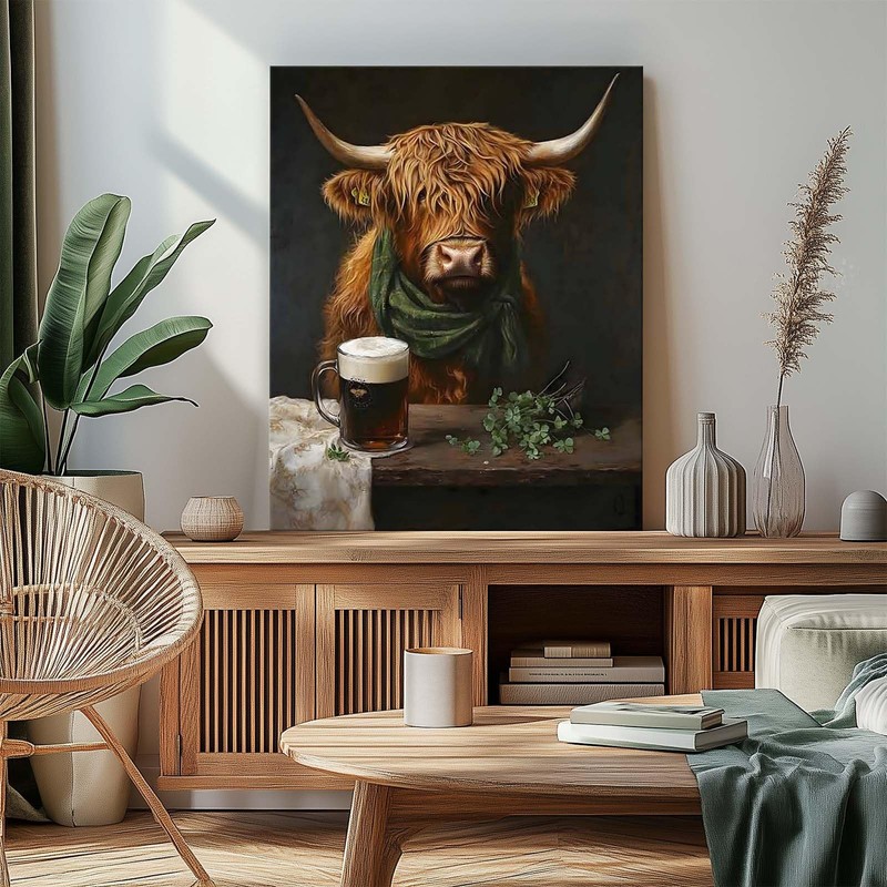 - Celebrate St. Patrick's Day with Charm: This St. Patrick's Day artwork features a Highland cow dressed in a green scarf with a beer and clovers, adding a fun twist to your holiday décor.