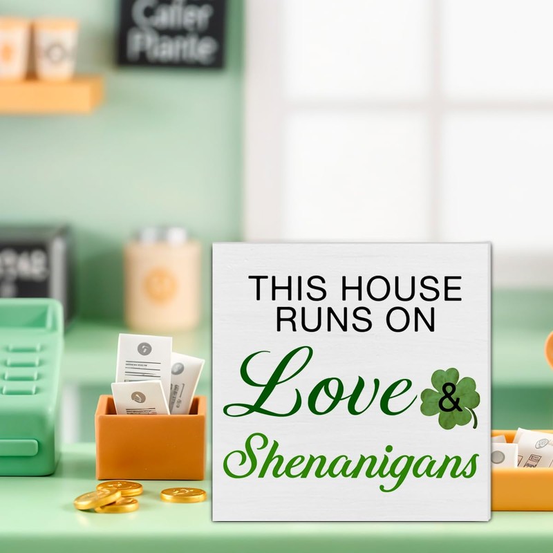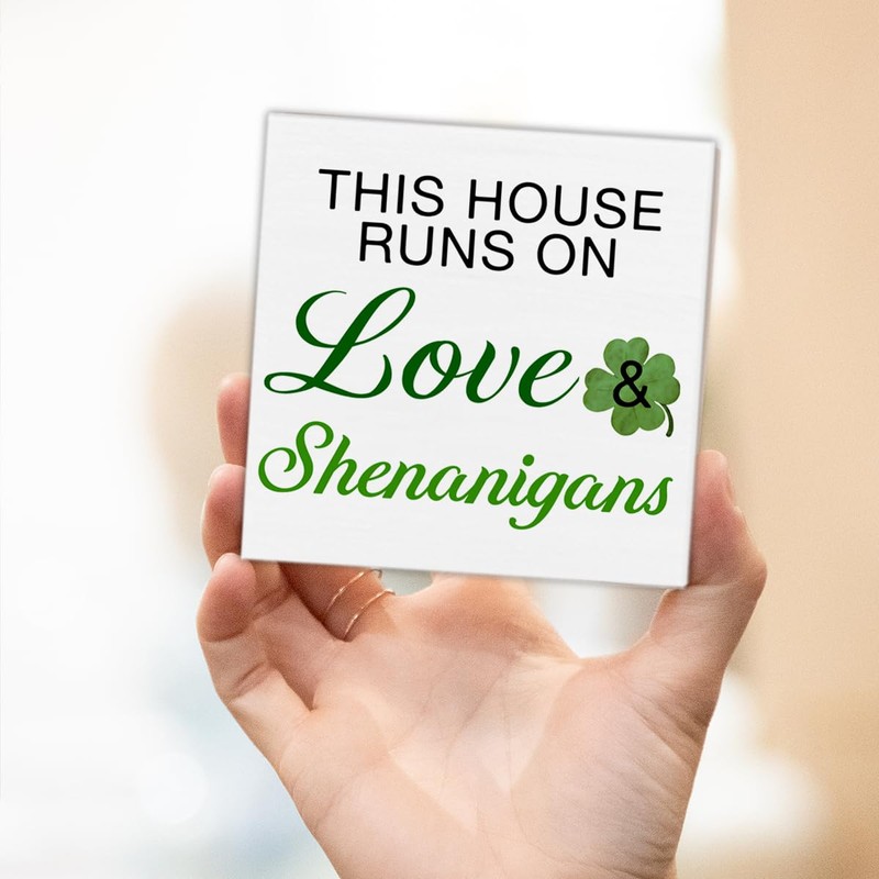 St. Patrick's Day Decorations, This House Runs on Love and Shenanigans Wooden Block Sign, Shamrock Decorations, St. Patrick's Day Home Decor for Desk Table Shelf, 5 X 5 Inches