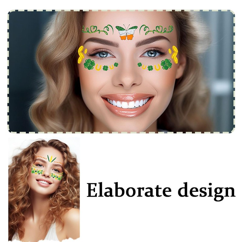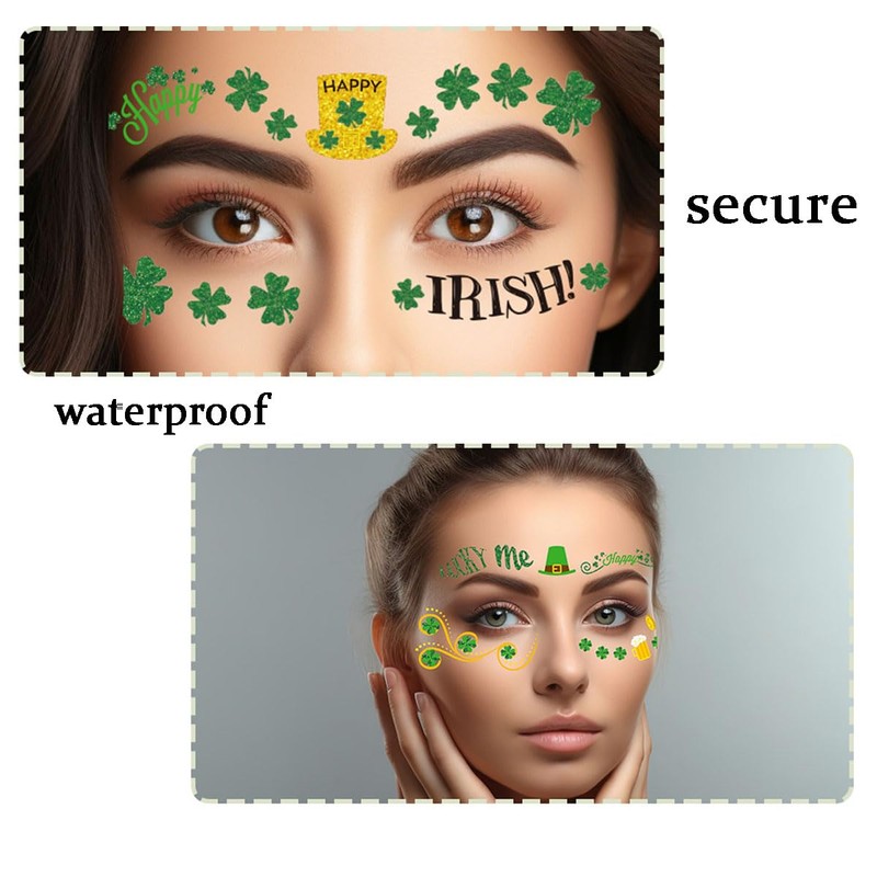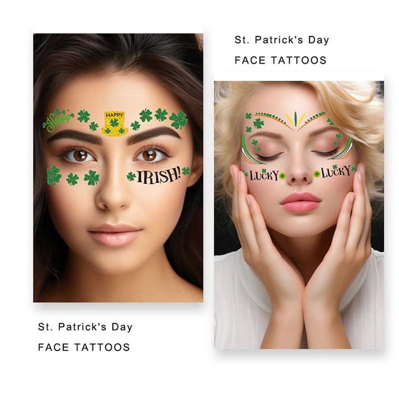 - St. Patrick's Day Shining Face Tattoo Set: You will receive 10 different designs of St. Patrick's Day Clover Shining Stickers to share with family and friends. Make you stand out at the party.