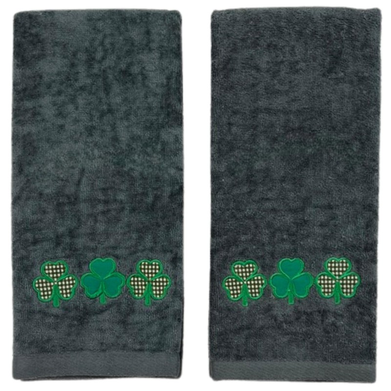 St. Patrick's Day Irish Kitchen Bath Guest Hand Towels: Soft Absorbent Embroidered Triple Green and White Shamrocks Clovers Design on Grey Gray, 16" x 25", 100% Terry Velour Cotton Oeko-TEX Certified