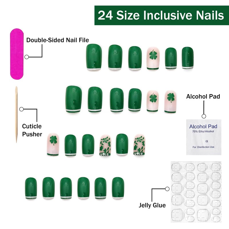 - Package Includes: 24 pieces St. Patrick's Day fake nails, 1 sheet of 24 pieces jelly glue, 1 piece of mini nail file, 1 piece of wooden stick and 1 piece alcohol pads. Crafted from durable acrylic, enjoy long-lasting use without worrying about chipping or fading.