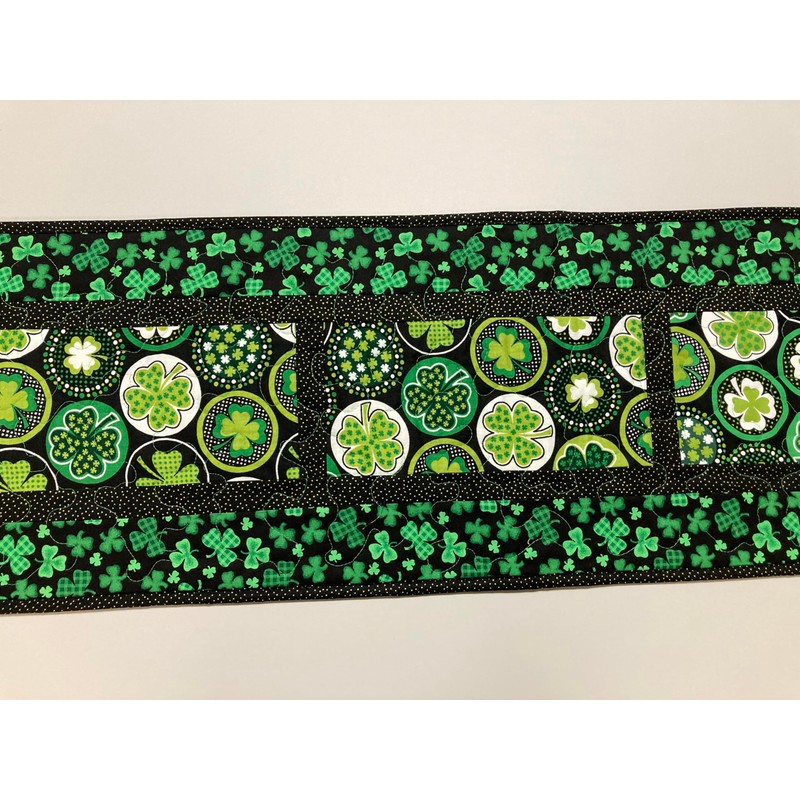 St Patrick's Day Shamrock Quilted Dining or Coffee Table Runner, 13x42" Reversible Spring Summer, St. Paddy's Green Black Mat TahoeQuilts Handmade