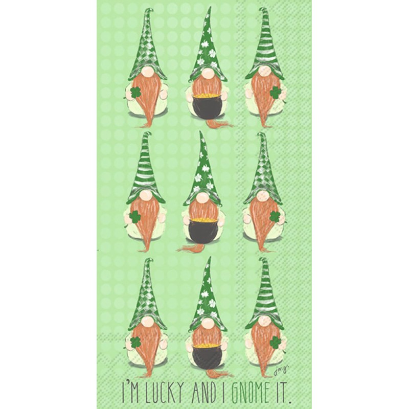 - Green napkin's design features leprechaun gnomes, sentiment reads: I'm Lucky and I Gnome it