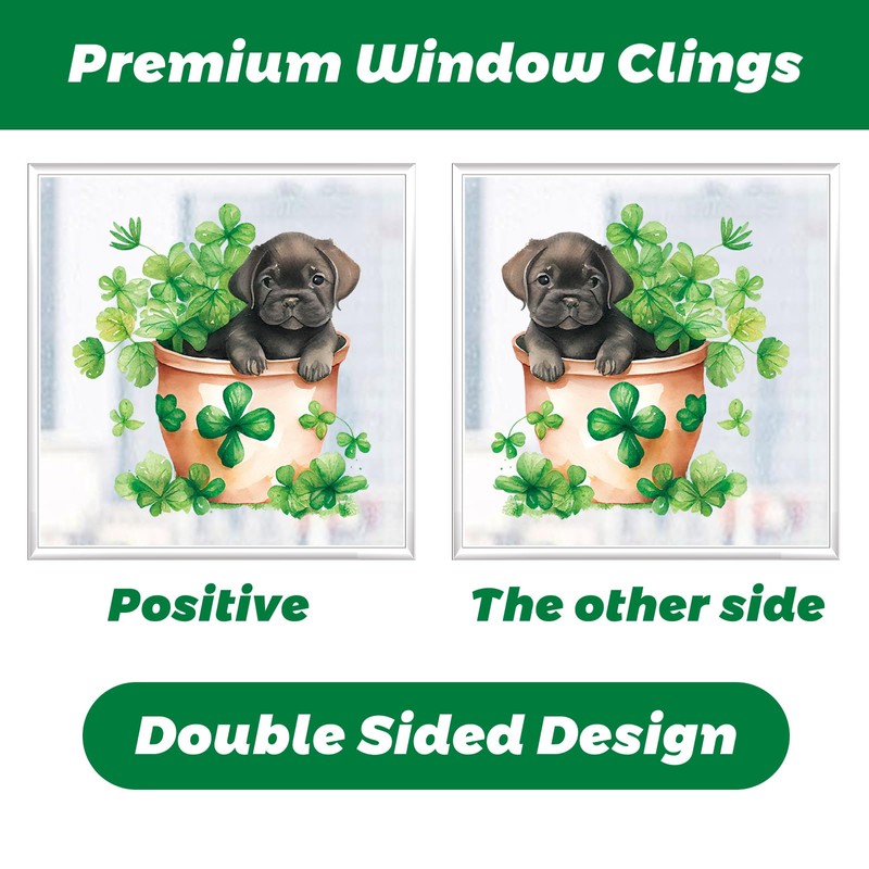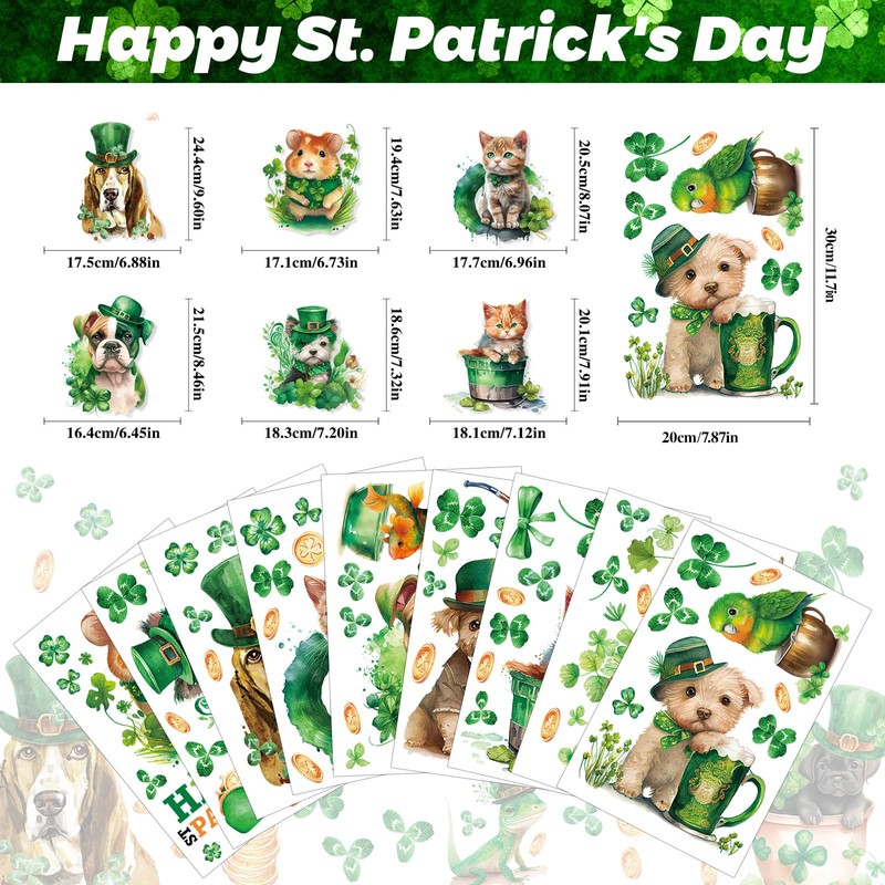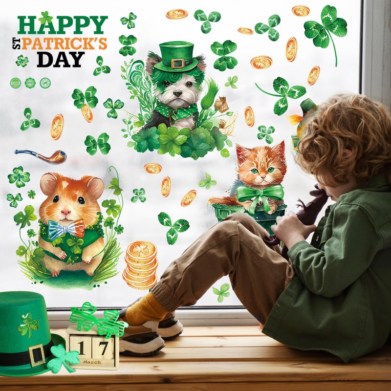 - BRIGHT HOLIDAY DECORATIONS - Decorate your home with super cute pet window stickers! The green-hatted costumed animals along with the classic clover and gold coin elements create a unique holiday atmosphere. A great St. Patrick's Day decoration that kids and adults alike will love!