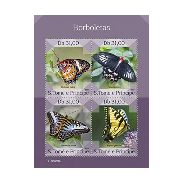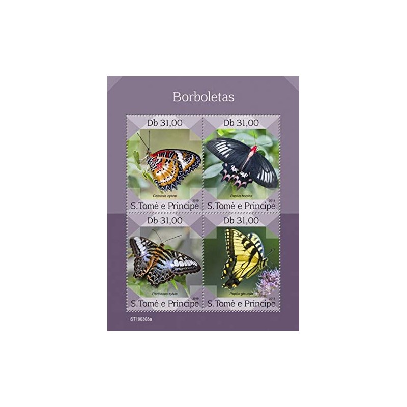 Country: St Thomas, Year of Issue: 2019, Type: 4 Stamp Sheet, Topic: Butterflies, Insect, Leopard Lacewing, Tailed Redbreast, Clipper, Eastern Tiger Swallowtail