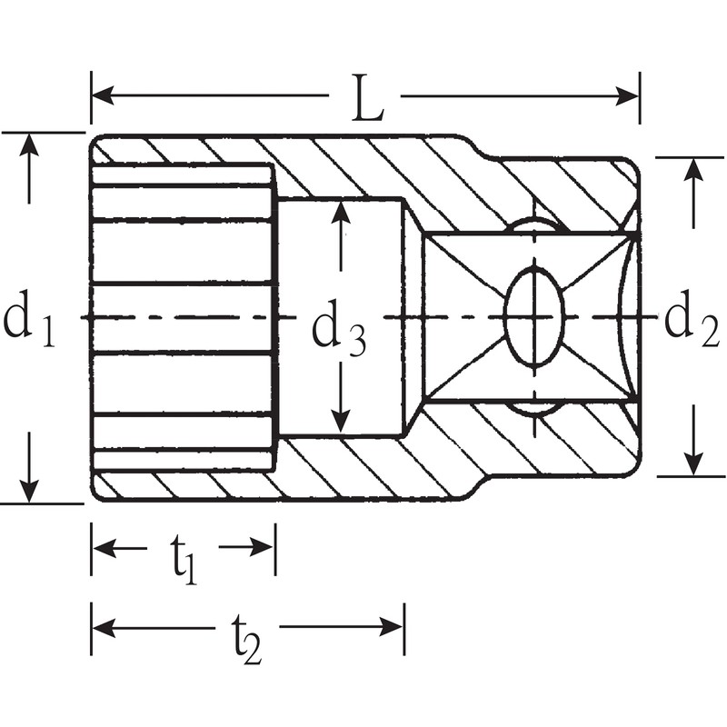 • Size: 3/8; Total Length: 1.1 inches (27 mm); Socket Outer Diameter: 0.5 inches (13.7 mm); Outlet Outer Diameter: 0.08 inches (16.5 mm); Socket Back Inner Diameter: 0.3 inches (8.4 mm); Inner Surface Depth of Bolt Contact Part (t1; mm): 0.1 inch (8.5 mm); Maximum Depth (t2 mm); Weight: 0 g)