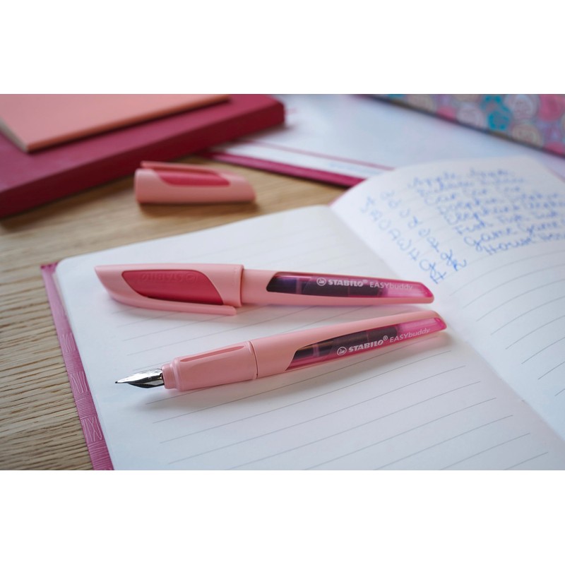 Der STABILO EASYbuddy ist der optimale Begleiter für kleine Helden und Heldinnen in der Grundschule. In ihm steckt das ganze Expertenwissen der STABILO Ergonomie-Profis, sodass ihren Kindern das Finden der richtigen Schreibtechnik einfacher fällt und sie jede Menge Spaß am Schreiben haben. Die universelle, rutschfeste Soft-Griffzone des ergonomischen Schulfüllers sorgt für sicheren Halt, was ein entspannte Stifthaltung fördert und einem frühzeitigen Ermüden der Muskulatur vorbeugt. Eine für den STABILO EASYbuddy speziell entwickelte Technologie minimiert zudem das Risiko des Auslaufens der Tinte. Die Feder mit integriertem Iridiumkorn gibt es in Varianten für Anfänger, geübtere Schreiber und Linkshänder. So kann sie entsprechend der Bedürfnisse des Kindes (Schreibdruck, Neigungswinkel, Händigkeit) ausgewählt werden, was bei einer leichten Schreibführung hilft und ein sauberes Schriftbild fördert. Nachfüllbar ist der Füller mit zwei Standardpatronen oder einer Großraumpatrone. Das extra große Sichtfenster sorgt für die leichte Kontrolle des Tintenstandes bei beiden Patronen.