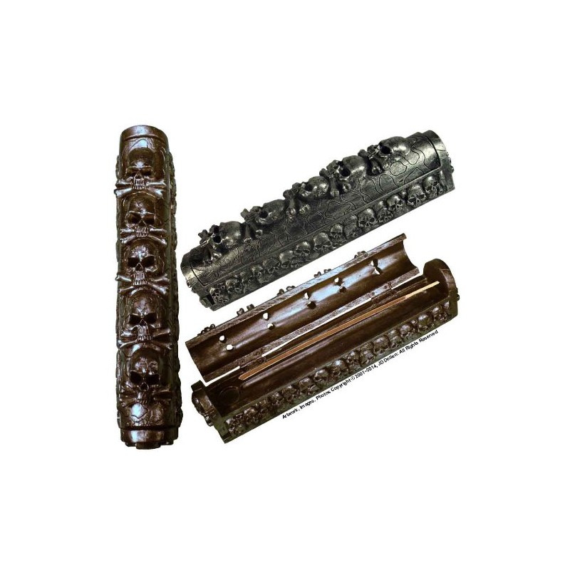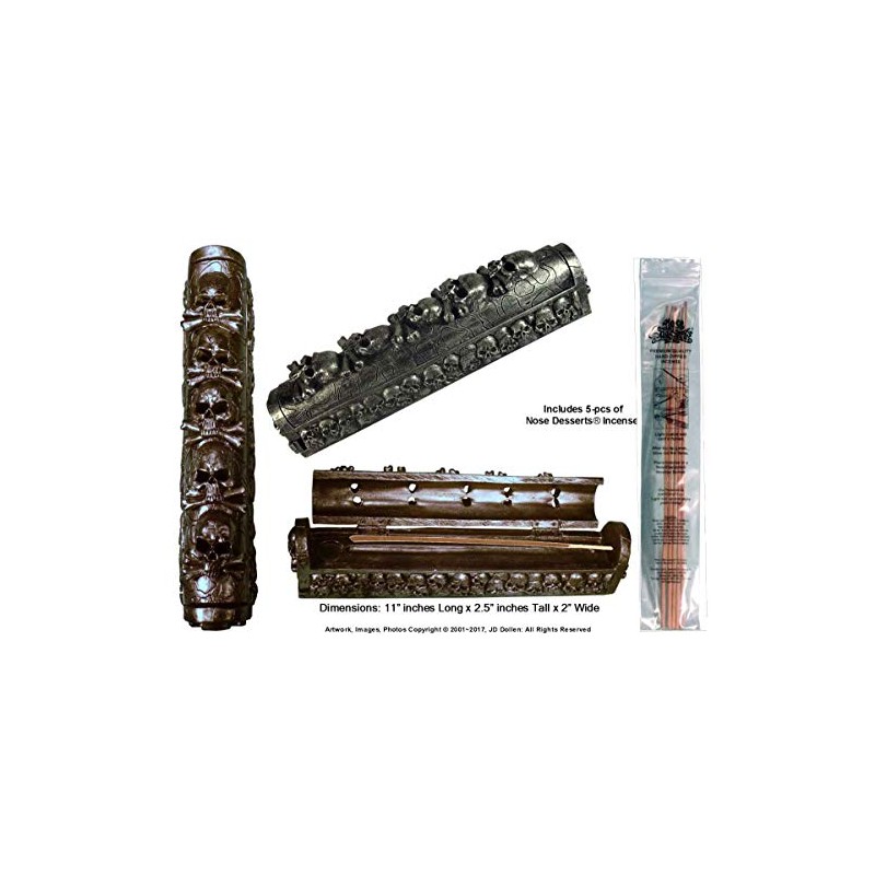 Stack of Human Skulls Coffin Box Stick and Cone Incense Burner-Ash-catcher, INCLUDES: 5-pcs of Nose Desserts brand 11-inch long stick Incense, for your enjoyment! (Our selection). This Incense Burner-Ashcatcher Coffin Box is made of durable polystone resin individually hand-crafted by our highly skilled craftsmen, the surface finish is individually hand painted in multi-hued soft colors with contrasting highlights. No two pieces are exactly the same, each one is unique, and there will be tonal variations in each one we individually hand craft. Our Incense Ashcatcher Burner will safely burn up to 11-inch long incense sticks and 1-inch tall incense cones. There are numerous airflow inlet - outlet holes in the top lid to allow the incense stick air for burning and for the fragrant incense smoke to flow out into the surrounding air. Inside about half way down there is a flat surface with a long indent to catch the incense ashes and a nice sized hole to hold the incense stick in the burning position. An end-side door swings open to reveal the hidden incense storage compartment space within the bottom half cavity for conveniently holding extra incense sticks or cones. The Lift-Up Flip-Top Hinged Lid Cover; our coffin box incense burner is designed to hold the burning-smoldering incense stick with the hinged top-lid in the OPEN or CLOSED position for safety to contain the lit incense stick when burning. The coffin box Flip-Top Hinged Lid Cover is top-heavy and when in the full open position, the heavy top-lid may cause the lower incense burner box to lift-up and tip off the surface to rest on the top-lid; therefore it is recommended for safety to, use this coffin box incense burner with the Flip-Top Hinged Lid Cover in the closed position. Dimensions: 11-inches long x 2.5-inches wide x 2-inches height. Your purchase Satisfaction is Guaranteed: If you are not completely satisfied for any reason with your purchase you receive, you may return your New Unused orde