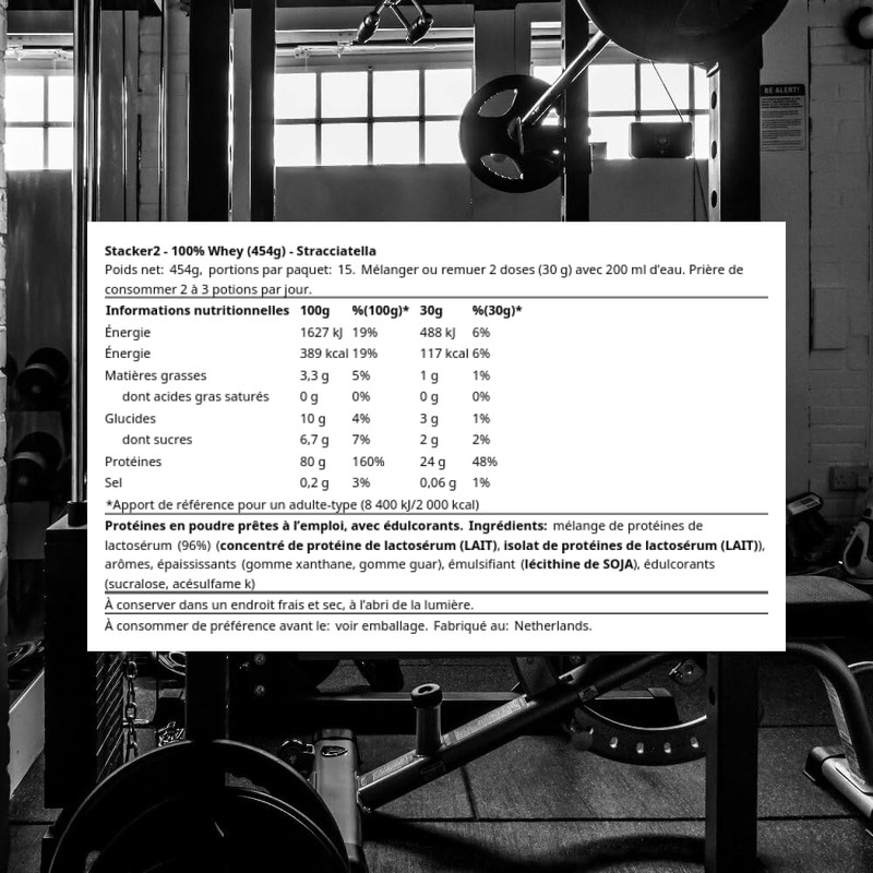 - Stacker2 - 100% Whey Stracciatella, 454 g content is enough for 15 servings of 30.3 g each