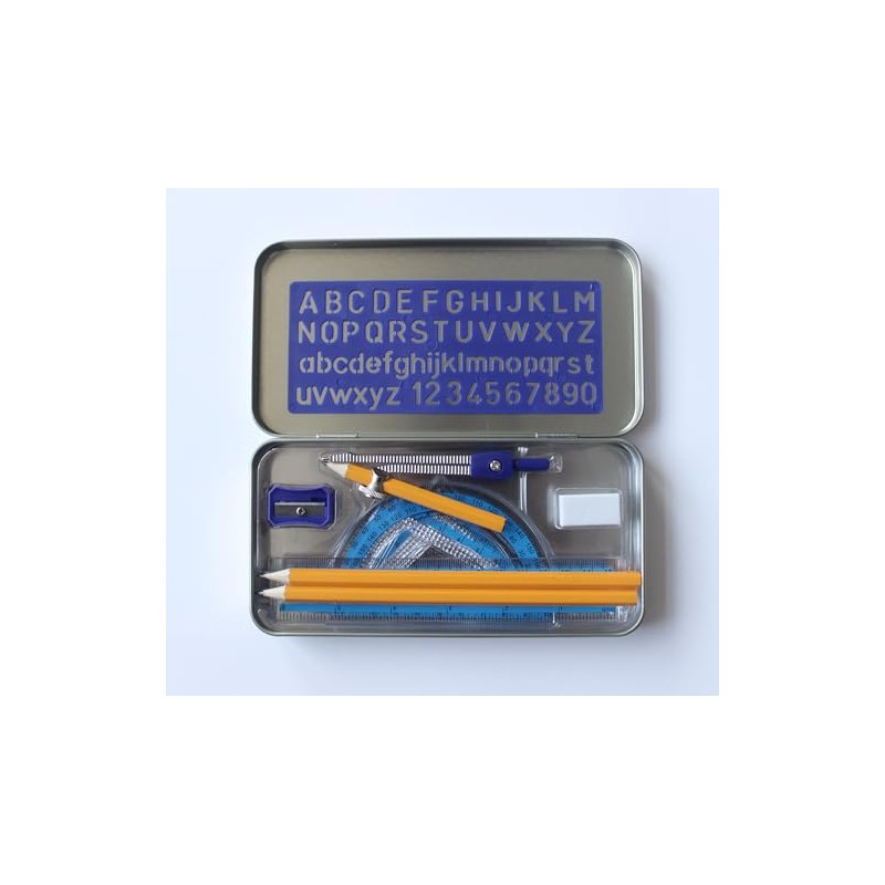 - Includes sharpener, eraser, pencil, compass, ruler and protractor