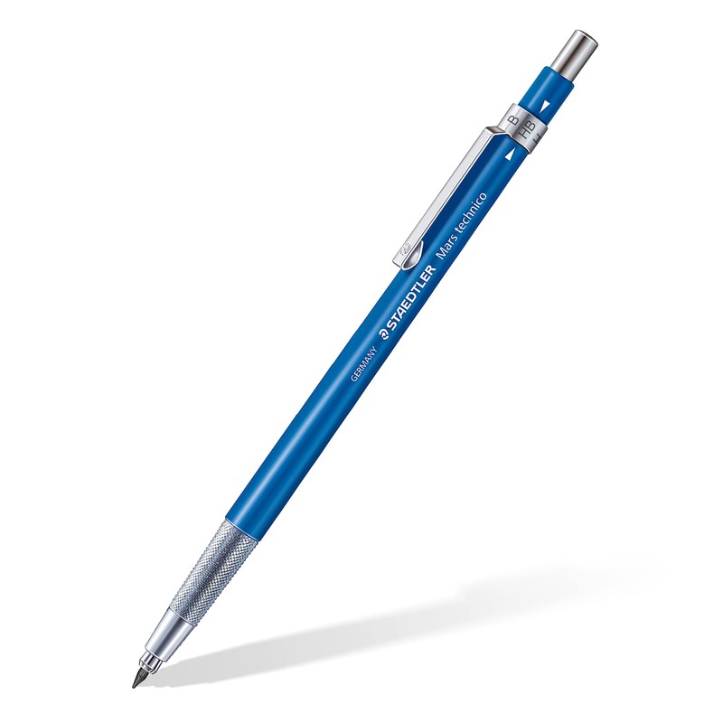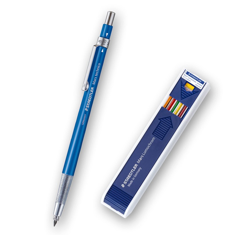 - Box contents: 1 Staedtler Mars Technico 780 C mechanical pencil in blue with HB pencil lead and 12 matching assorted Mars Lumochrome colour drawing refills.