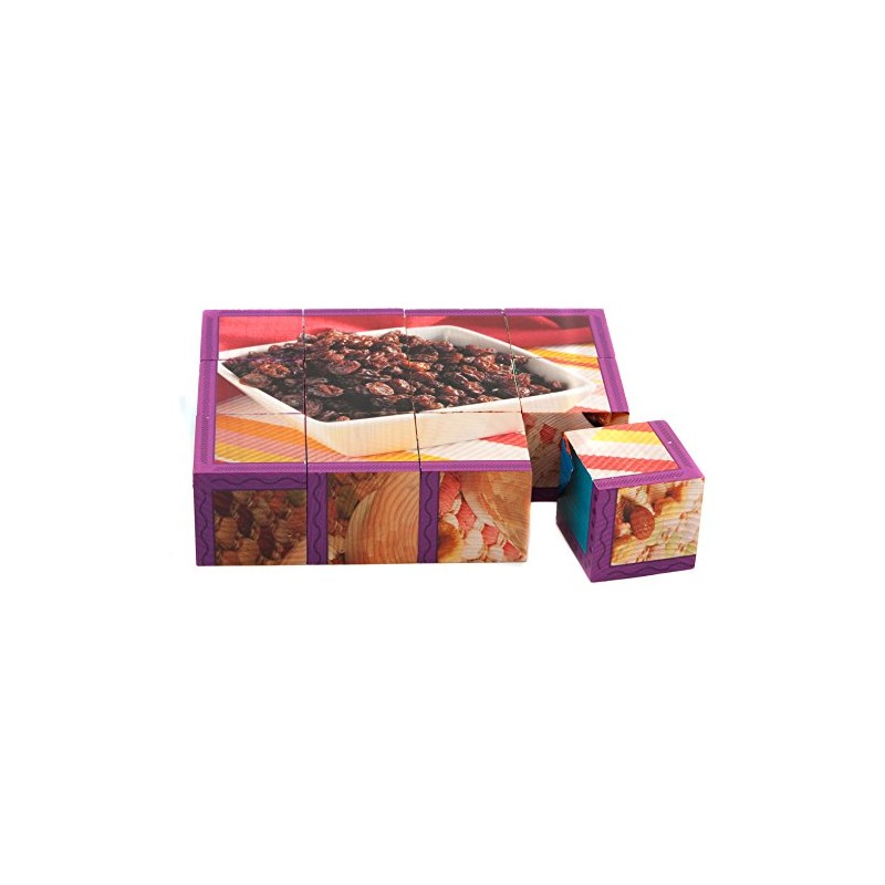 Stages Learning Materials Real Picture Snack Foods Wood Cube Puzzle Language Builder Preschool Puzzle 6 Puzzles in 1, 12 cubes, 6 Education Fact Cards