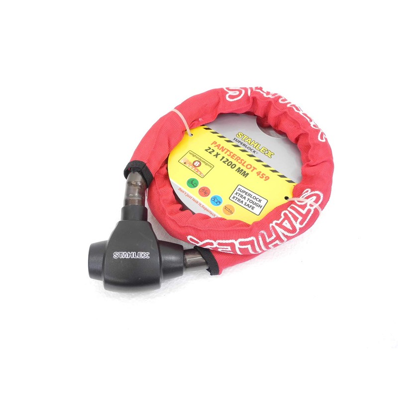 Robustes Diebstahlschutzschloss für Motorräder Superlock 459 22 x 1200 mm 9606 Kette gezahnt und flexibel zugleich Kapsel mit Doppelzapfen aus gehärtetem Stahl sehr schwer zu verbiegen Hochwertiges, aufbrechfestes Schloss; Durchmesser 22 mm, Länge 120 cm, Gewicht 0,9 kg Der Schließzylinder verfügt über eine selbstdichtende Schutzlippe gegen Diebstahl, Feuchtigkeit und Salzwasser, sodass sein Betrieb auch bei Regen und Eis sicher ist Mit zusätzlicher Nylonbeschichtung zum Schutz der Lackteile an Motorrädern und Fahrrädern<br/>