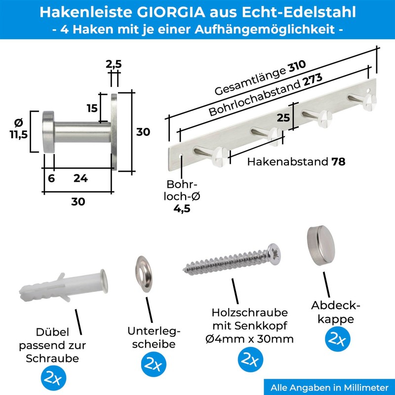 - You will receive a hook rail made of real stainless steel with 4 hooks (Giorgia model). In addition, a complete mounting kit of screws, dowels, washers and facing caps is included.