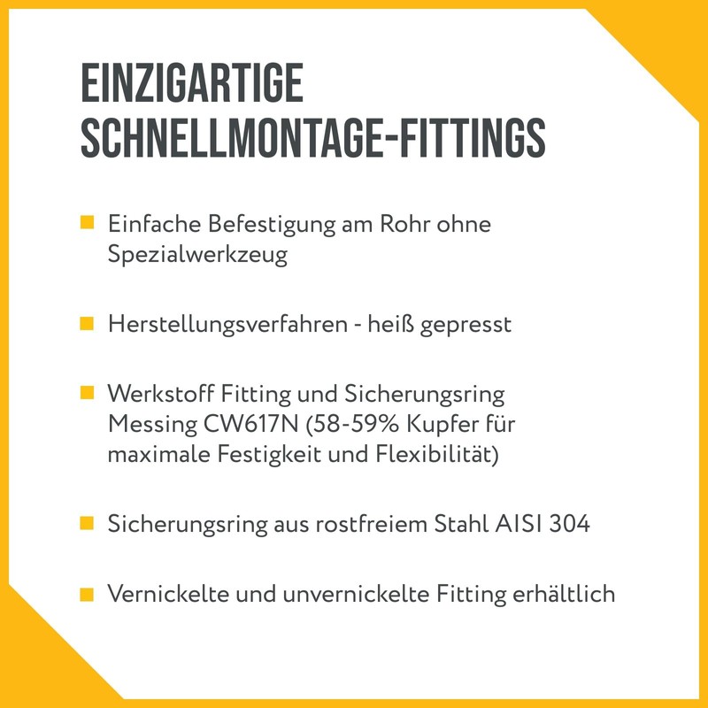 • The material of the fitting and locking ring is CW617N brass (58-59% copper), provides maximum strength and (58-59% copper, provides maximum strength and ductility)