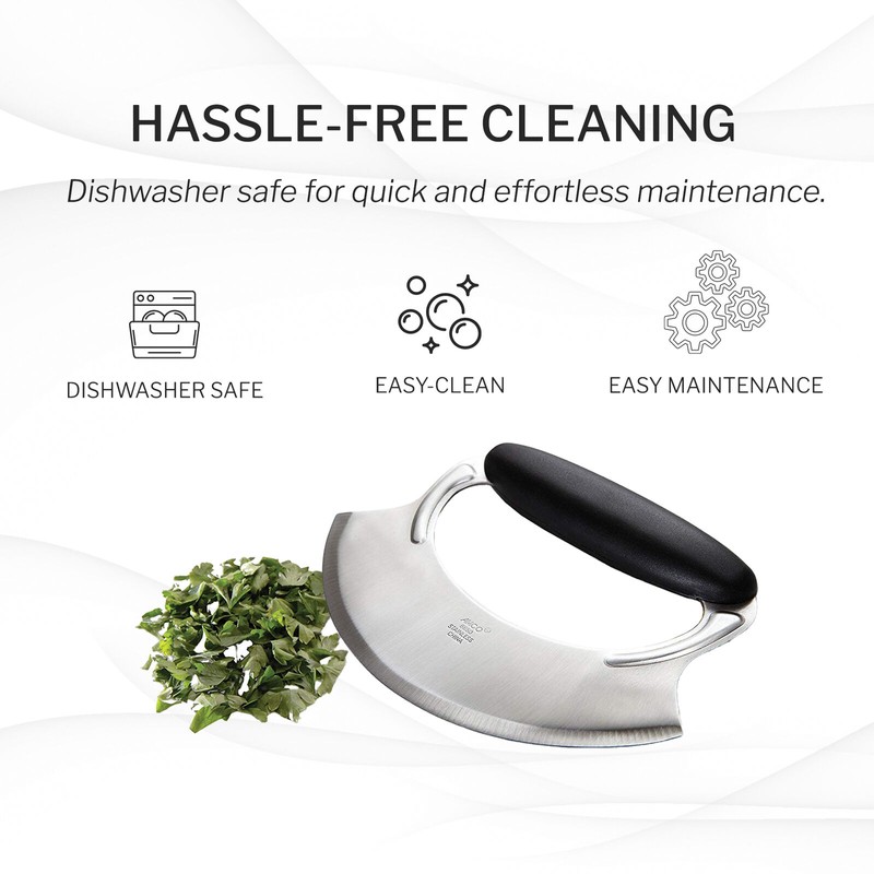 - Made of stainless steel with a beveled edge allows you to use a rocking motion, making it an effortless task to chop and mince fruits, vegetables and herbs