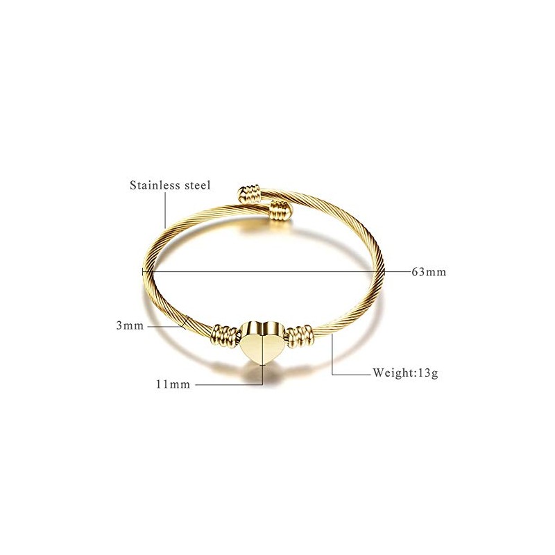 Stainless Steel Adjustable Cable Wire Heart Charm Bangle Bracelet Anniversary (Gold)