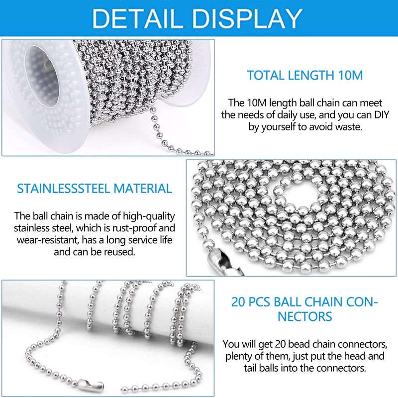 - Package contents: the package contains a 10 metre ball chain, which is long enough to meet your requirements, and 20 ball chain connectors. Sufficient quantity and reusable.