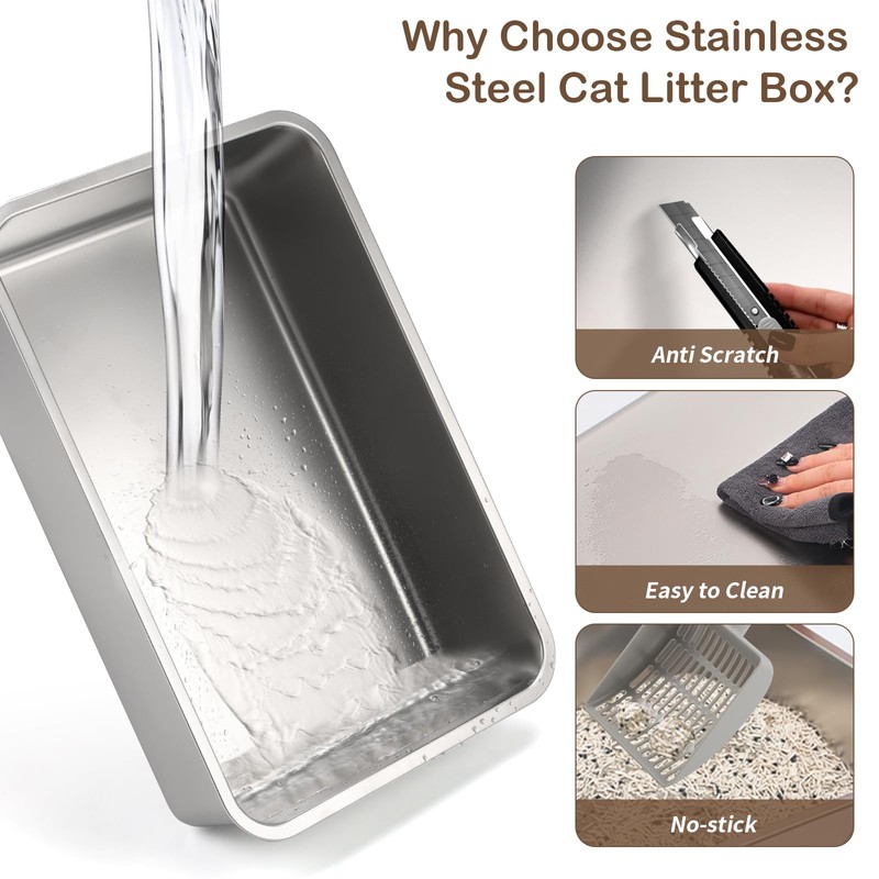 - 【ODOR CONTROL & VENTILATION】: Enhanced airflow design with built-in ventilation slots minimizes odors in this kitty litter box. Made of premium stainless steel that resists rust, stains, and lingering smells. The smooth, non-stick surface prevents scratching and litter clumping.