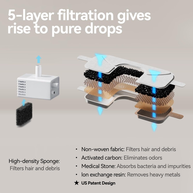 - [5-Layer Filtration System]The cat water dispenser features a 5-layer filtration system. Activated carbon removes bad taste and smell. Ion exchange resin softens tap water. Medical stone extracts heavy metals and releases trace elements. Non-woven fabric filters out hair and dirt. High-density sponge of the pump helps remove tiny particles. (Please search [B0DH1WFD6R] to buy the real filters.)