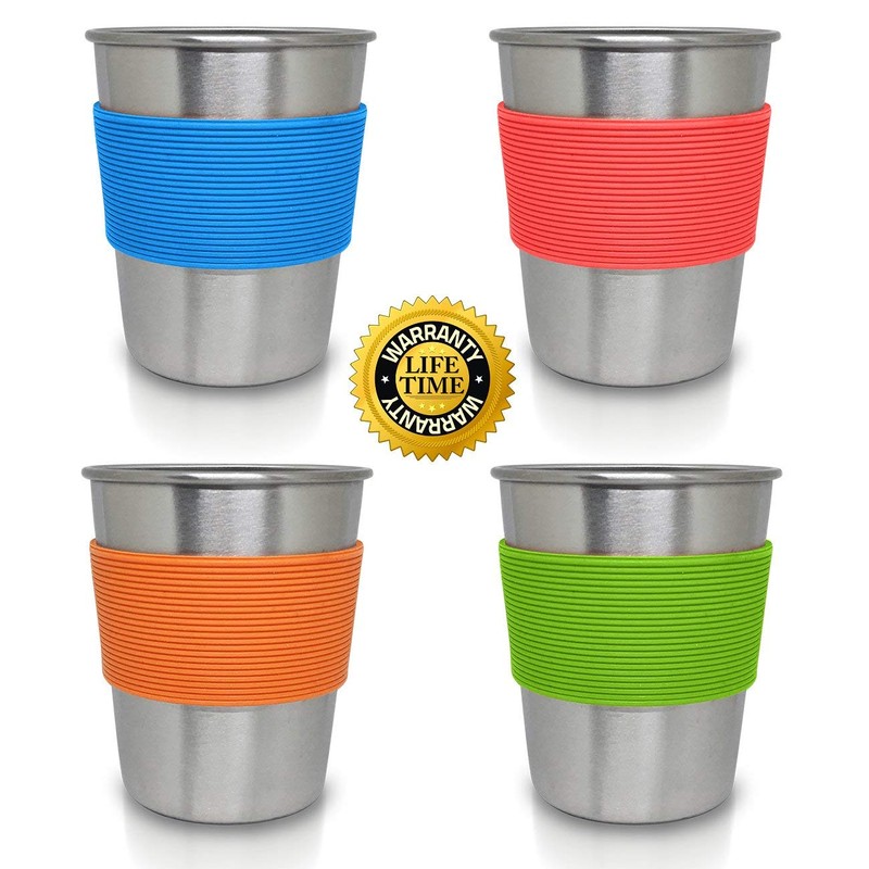 Stainless Steel Cups for Kids and Toddlers 8 oz. with Silicone Sleeves - Small Metal Cups for Home & Outdoor Activities, BPA Free Healthy Unbreakable Premium Metal Drinking Glasses (4-Pack) by CHILLOUT LIFE Store