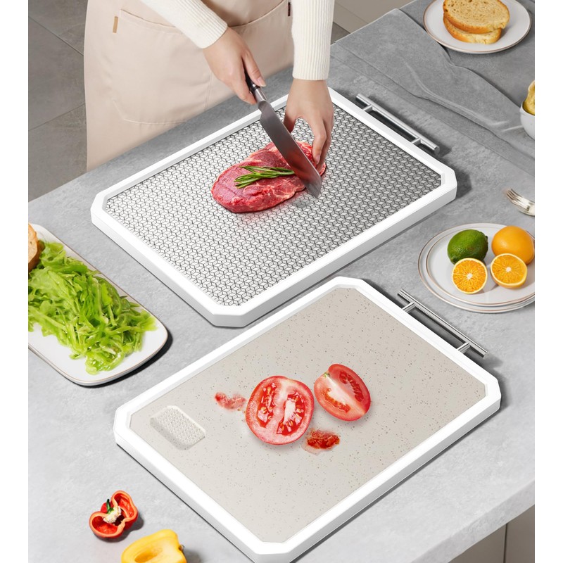 - [Double-sided use]: Enjoy the flexibility of two different surfaces on one cutting board. Cut meat on one side and cut fruits and vegetables on the other to avoid mixing food flavors.