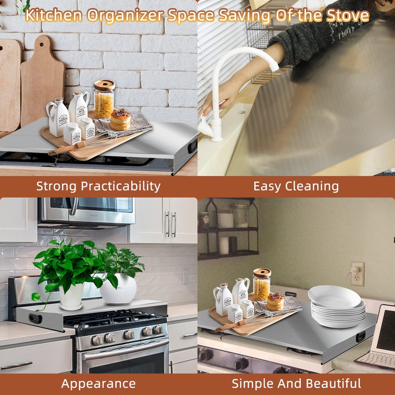 - Very Practical: This sliver stovetop cover is a new patent product. As a kitchen organizer expands kitchen space, so that provide an extra work surface. In addition, you can use it as cutting board/ noodle board/ sink cover. It’s the best solution to help you have plenty of room to prepare wholesome meals for your family on this generous working surface.