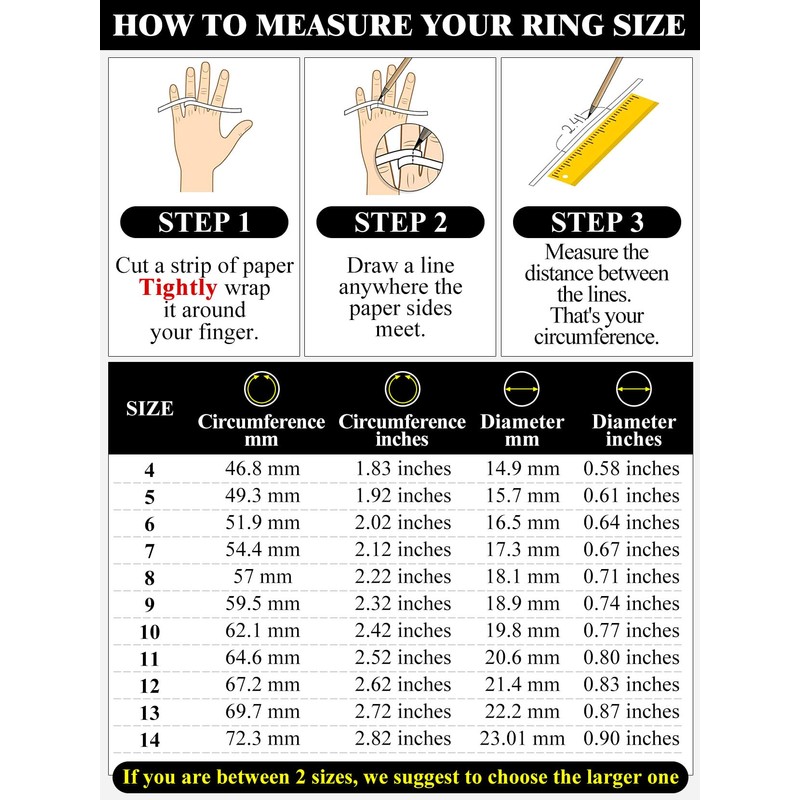 Fits for finger 7-14 size. You can wear it by itself, or stacking with your other rings.