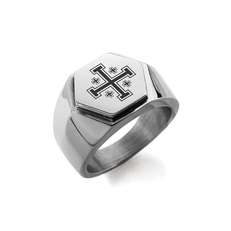 Stainless Steel Jerusalem Cross Hexagon Crest Flat Top Biker Style Polished R...