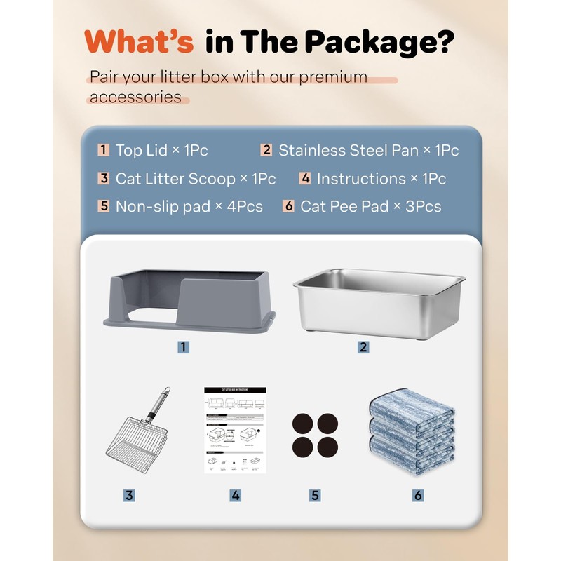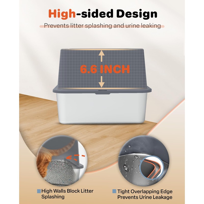 - Superior Leak-Proof Design: With 6.6-inch high walls, this steel litter box with enclosure effectively prevents urine or litter splashes, keeping your floors clean. The overlapping design between the stainless steel litter pan and the lid forms a tight, leak-proof seal, ensuring no leaks occur through the seams. Say goodbye to messes and hello to a cleaner, more hygienic home