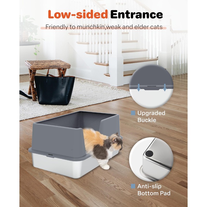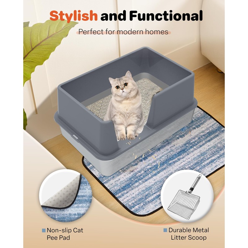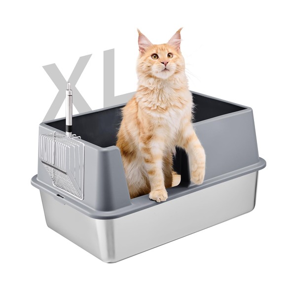 Stainless Steel Litter Box with Lid, Extra Large Metal Cat Box for Big Cats, High Sided Kitty Litter Box with Scoop, XL, Open Top, Non-Sticky, Anti-Leakage, Easy to Clean (Gray, X-Large)