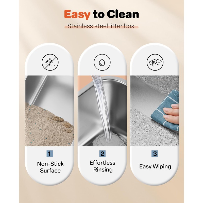 - Easy to Clean & Odor Control: Cleaning this cat box is a breeze. The smooth stainless steel surface ensures litter slides off effortlessly—nothing sticks. Just rinse with water for a spotless clean and wipe with a cloth for a residue-free surface. Plus, the material's odor control properties of stainless steel keep unpleasant smells at bay, leaving your home fresh and odor-free
