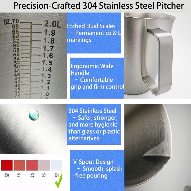 • Dual Etched Measurement Scales: Features both ounce (2–70 oz, 2 oz step) and liter (0.1–2.0 L, 0.1 L step) measurement markings, precisely etched into the metal for long-lasting visibility. No risk of fading or chemical leaching, ideal for accurate measuring