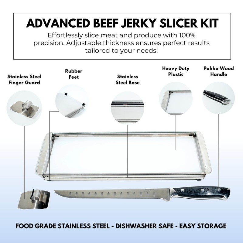 - MAKE JERKY FAST – SET 1/8, 1/4 or 3/8th THICKNESS, place meat atop manual slicer machine and simply run meat cutting knife through the rails. This DISHWASHER SAFE food slicer pops right in for the easiest post jerky cleanup ever. Just 5 simple steps, and you’re enjoying jerky every day.