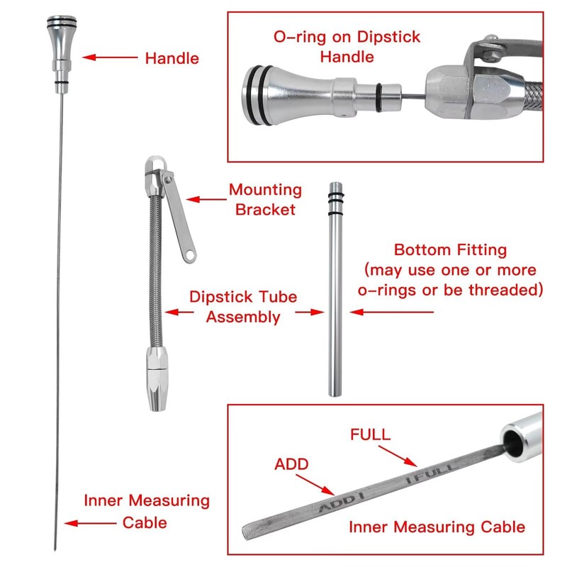 Note: Make sure the braided stainless steel part of the dipstick tube assembly is not touching the exhaust at any point. Package Includes: 1x Oil Dipstick