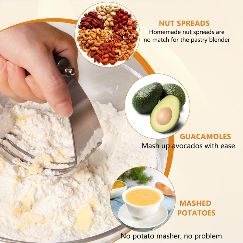 - Effortless mixing: the stainless steel pastry cutter quickly cuts butter or margarine into dry ingredients such as flour, sugar or baking powder, combines a set of damp and dry ingredients perfectly and allows you to bake your cake or biscuit bases like a chef.