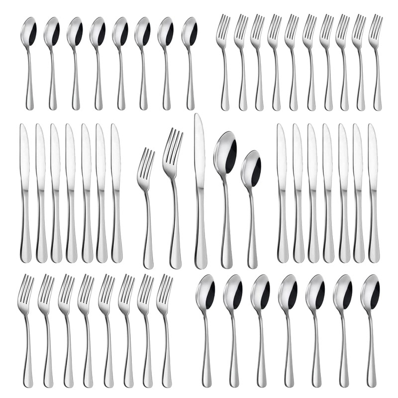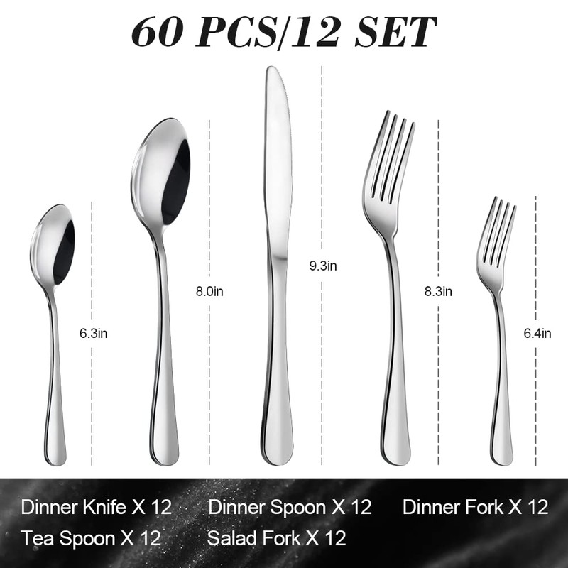 - 60 pcs silverware set for 12: Stainless steel flatware set include 12 dinner forks, 12 dinner spoons,12 dinner knives, 12 teaspoons, 12 salad/dessert forks, suitable for most families.Provide convenient and enjoyable dining experience.