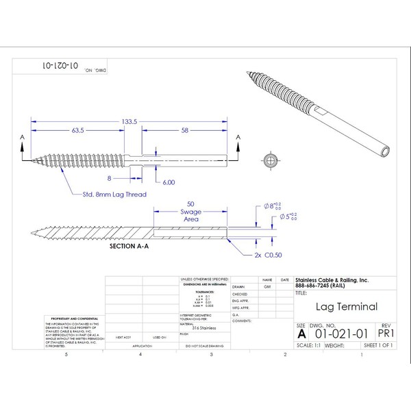 Stainless Steel Swage Fine Line Lag Screw Terminal End for 1/8" Wire Rope Cable to Mount in Wood Deck Railing Posts (1)