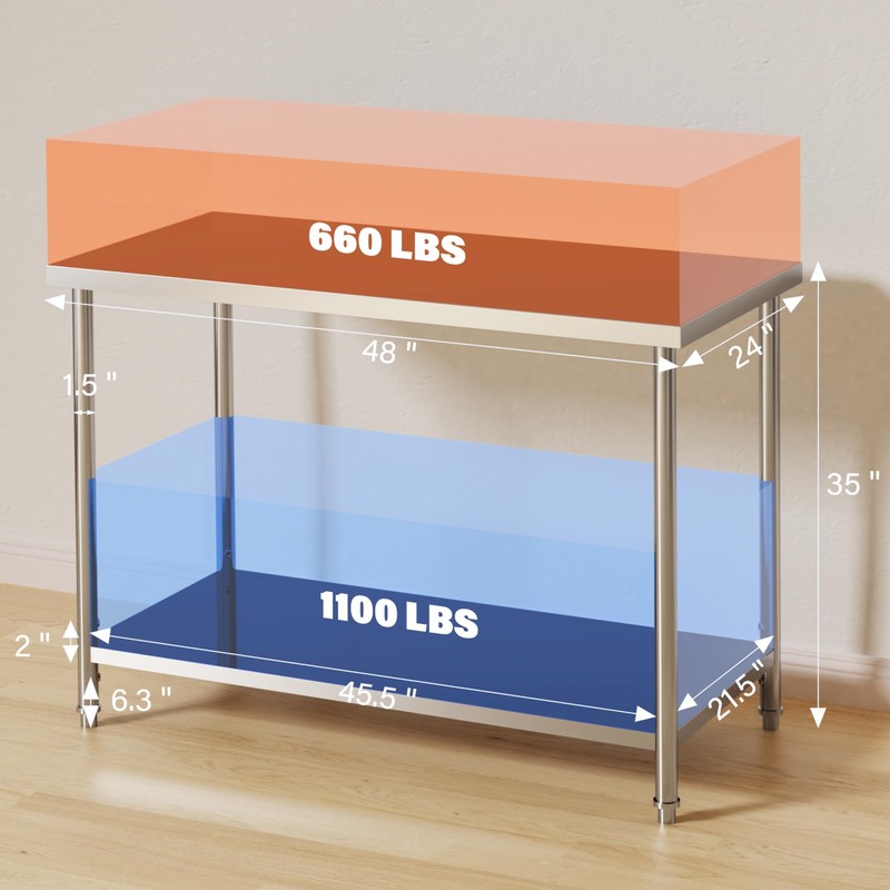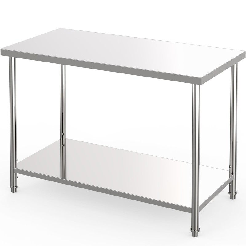 Stainless Steel Table, 48" x 24" Commercial Prep Work Table with Adjustable Undershelf and Pre-installed Feet, 2 Tier Metal Table for Restaurant, Home, Kitchen, Garages and Outdoor