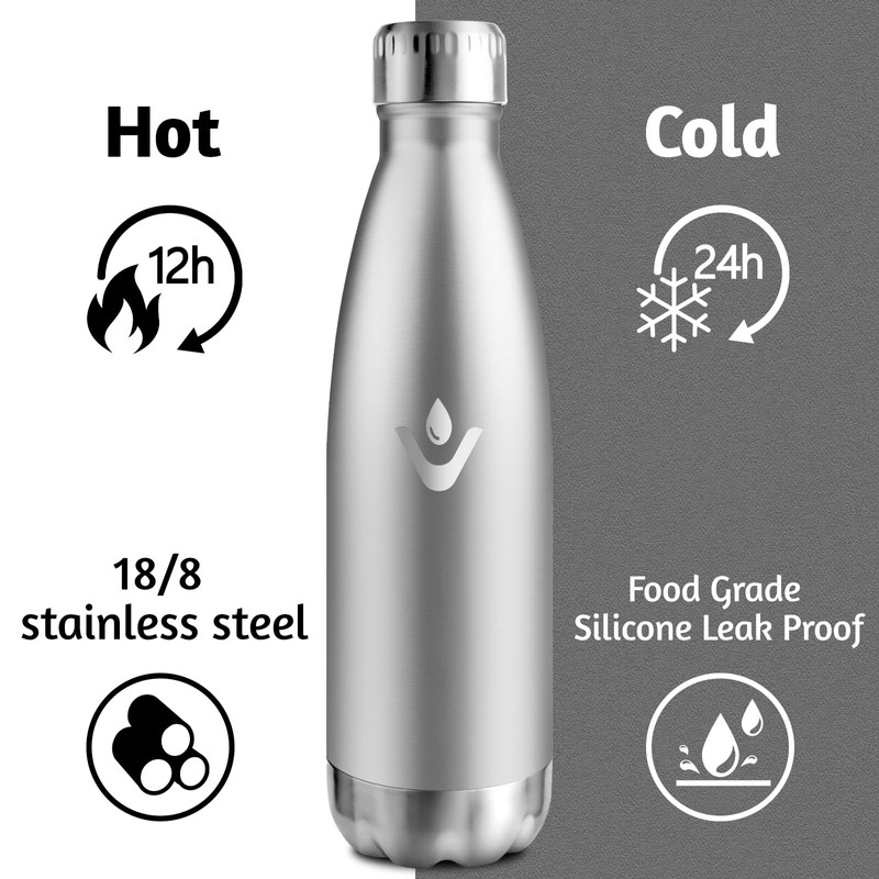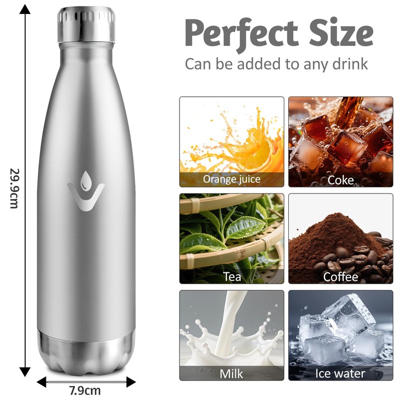 - Leak-proof design: secure and leak-proof lid, 100% leak-proof. Completely leak-proof and very easy to open. Lightweight design with stylish cola style. The water bottle can be taken anywhere for drinking. The stainless steel drinking bottle can drain condensation from the outside, does not sweat on hands or in bags, does not get wet in books, backpacks and desks.