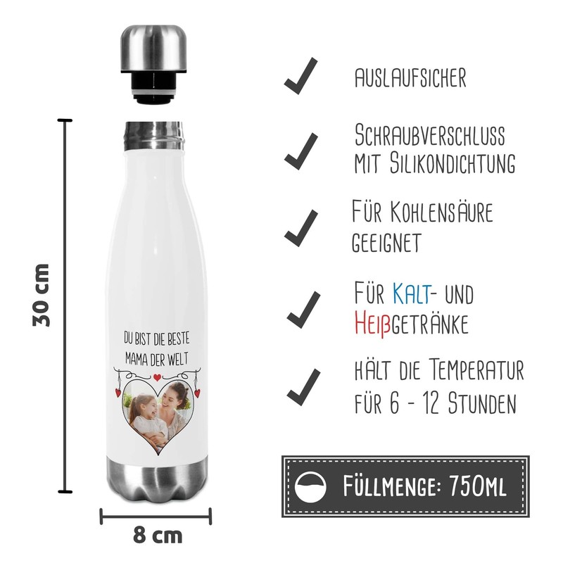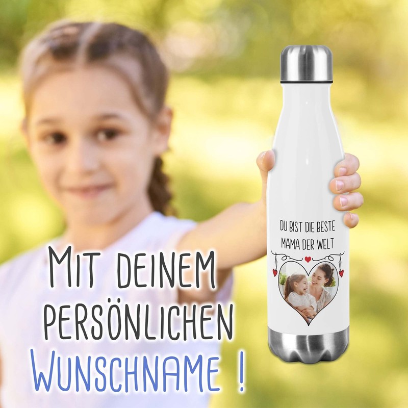 Stainless Steel Water Bottle with Photo in Frame & Text - Thermos Flask, Water Bottle, BPA-Free, Camping, School, Sports I Personalised Gift, Heart Shape, 750 ml