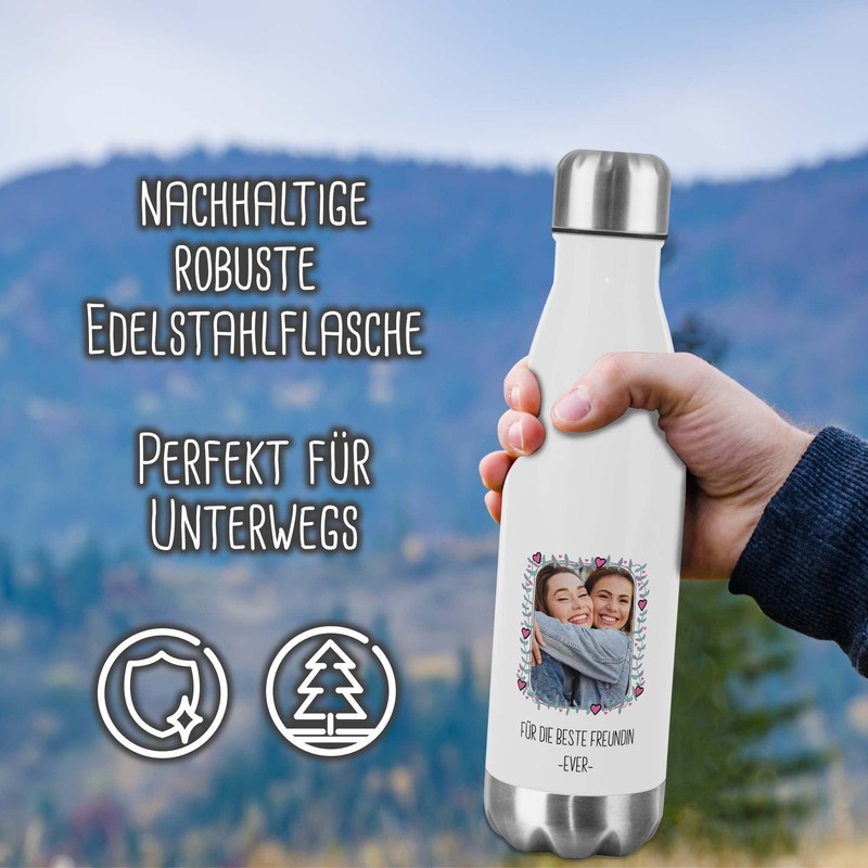 Stainless Steel Water Bottle with Photo in Frame & Text - Thermos Flask, Water Bottle, BPA-Free, Camping, School, Sports I Personalised Gift, Heart Vine, 500 ml
