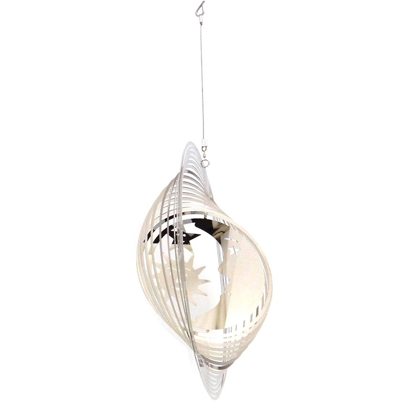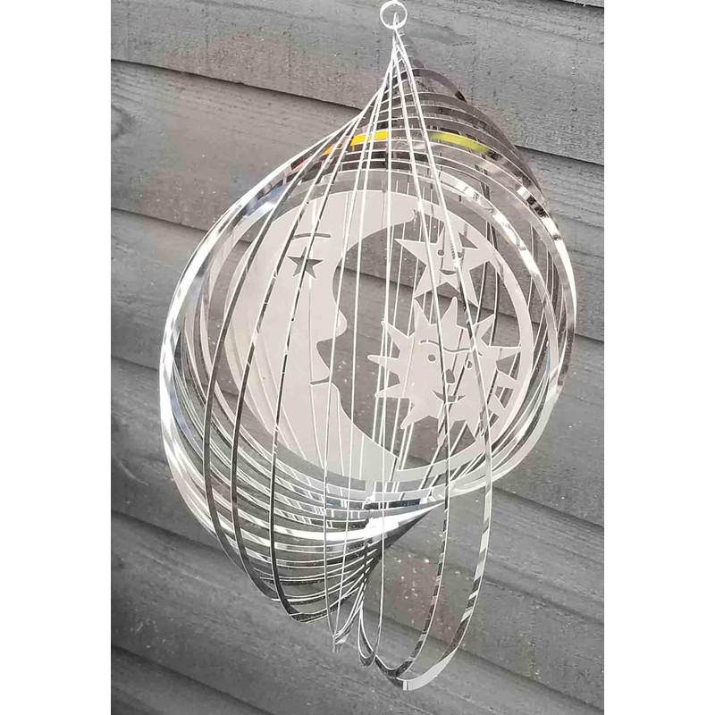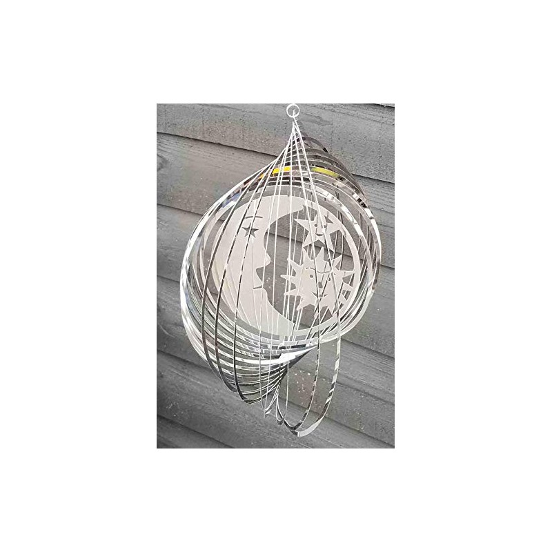 - Polished Stainless Steel Wind Spinner - Sun Moon Design, lightweight, easy to hang and simply twist the spinner into shape for 3D effect