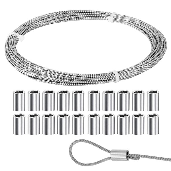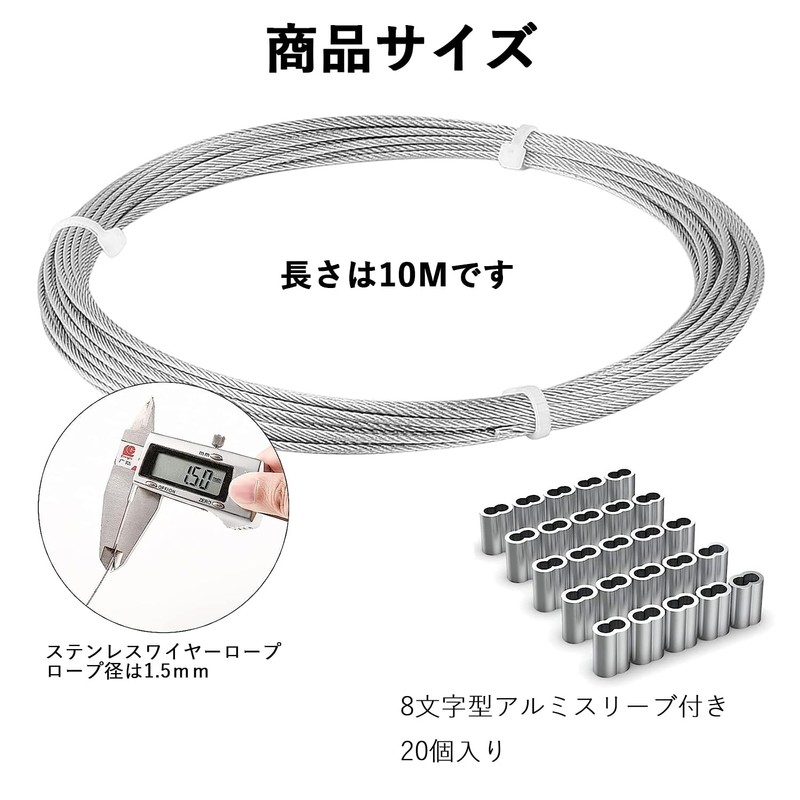 - Product Specifications: Product Name: Stainless steel wire rope. Rope diameter 0.06 inches (1.5 mm), length 32.8 ft (10 m). Pack of 20 with 8 letter aluminum sleeves Combine with terminal hardware for a variety of occasions. Great for home use as well as industrial use